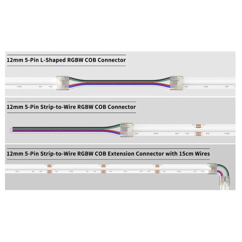 This pack of 5 Solderless COB Tape-to-Wire Connectors is specially designed for use with 12mm IP20 RGBW COB LED strip lights. These connectors make it easy to connect your RGB COB LED strip lights to a power source without the need for soldering.
