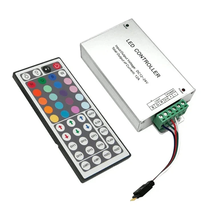This Controller for a 12/24V DC and 24A RGB LED Strip can shift between different lighting modes, which variate by brightness, colour and speed. It also features programmed colour modes.