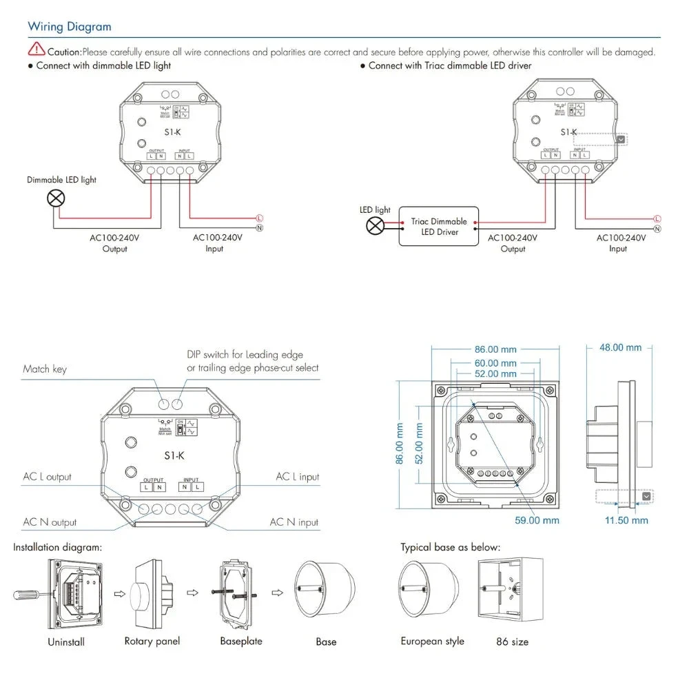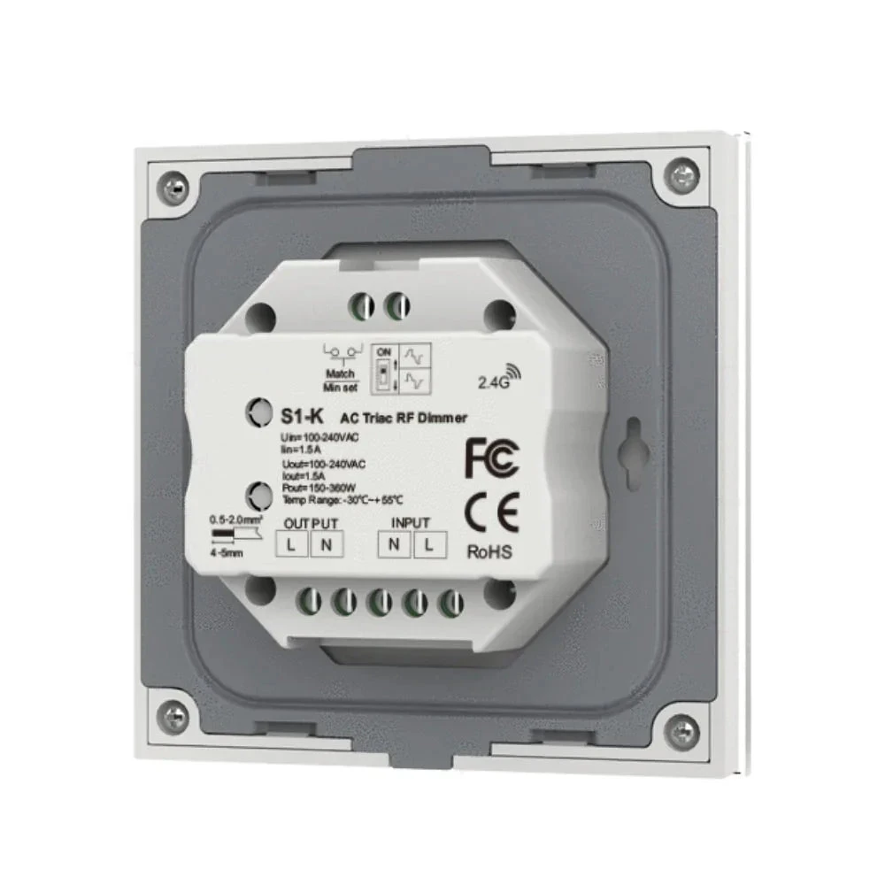 The AC Triac Rotary Glass Panel Dimmer Model No.: S1-K is a wireless dimmer that can be used to control the brightness of dimmable LED lamps, Triac dimmable LED drivers, incandescent lighting, and HV halogen lamps. It features a rotary knob and a glass panel for easy and convenient use. The dimmer can be controlled wirelessly using an RF remote control with a control distance of up to 10m in barrier-free space. It has 256 dimming