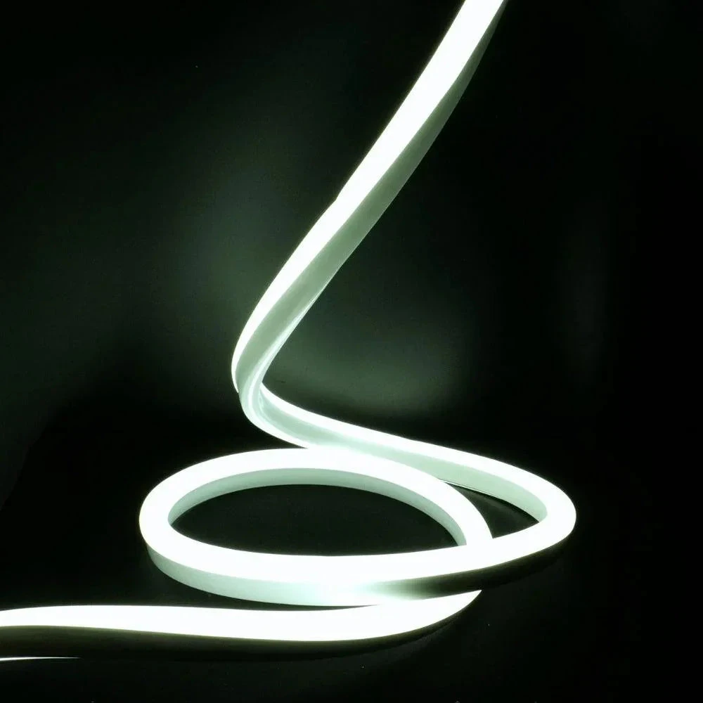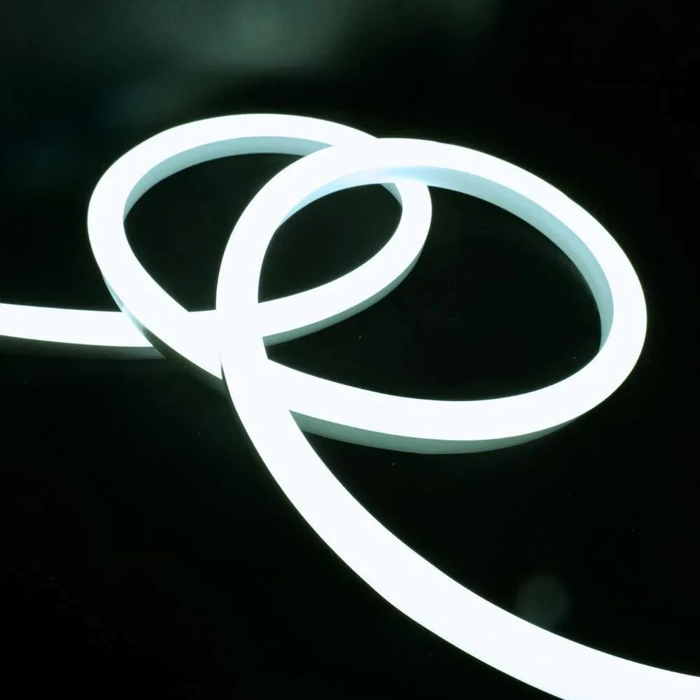 Introducing our brand new range of IP65 (splashproof) Neon Flex, at only 14 x 25mm and featuring a >90 CRI spot-free high lumen output. It can be cut every 100cm (1 metre) and can do 50 metre run without one controller. This is a horizontal bend neon flex.