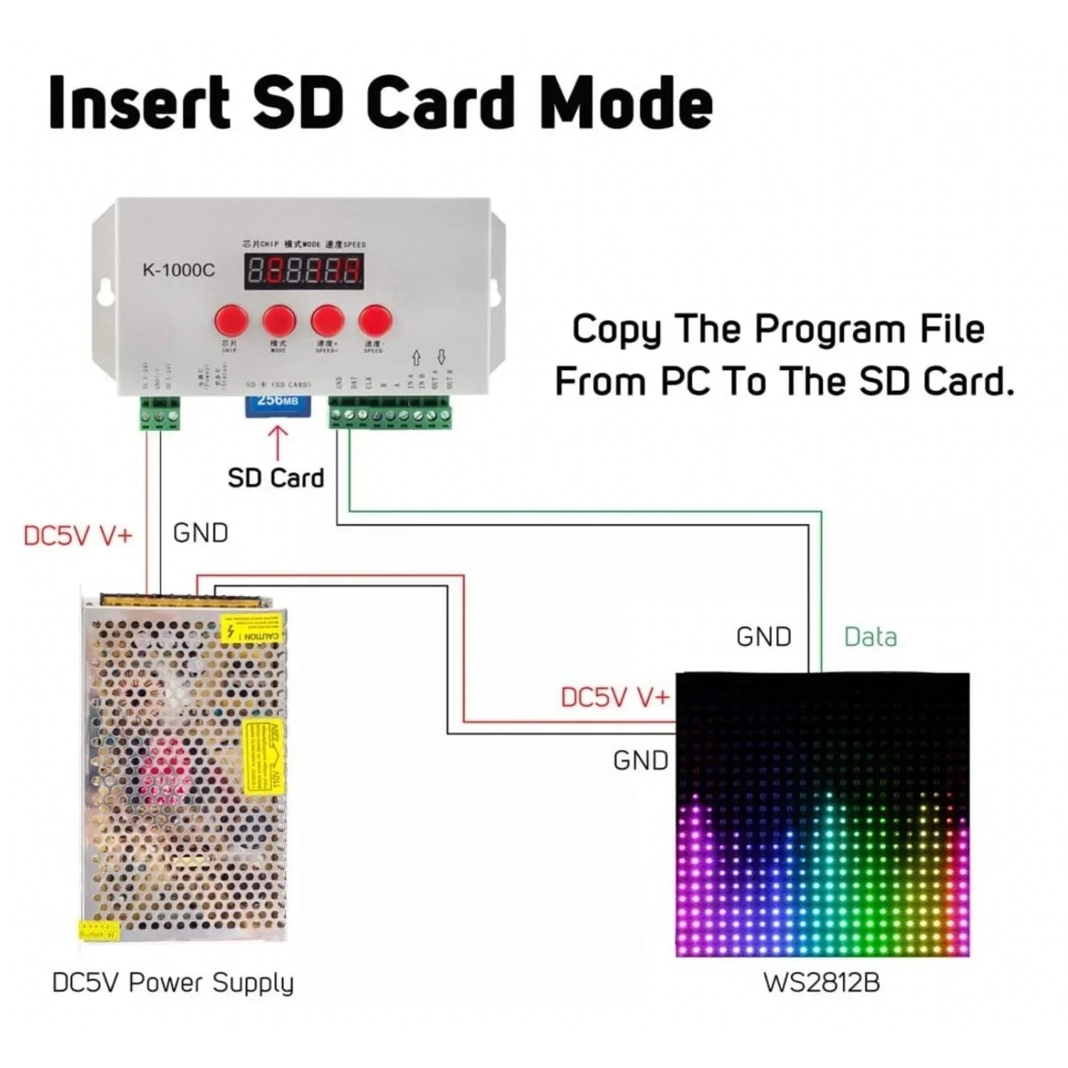 - Professional K-1000C controller an upgrade of T-1000S: It supports all the smart IC on the market. Including WS2812B, WS2811, WS2813, SK9822, SK6812RGBW, APA102C, WS2801,etc . All the dual data-led chip, data, and clock led chip, single data-led chip. It is suitable for engineering projects or customers’ DIY projects. Support SD card 128MB-32GB.