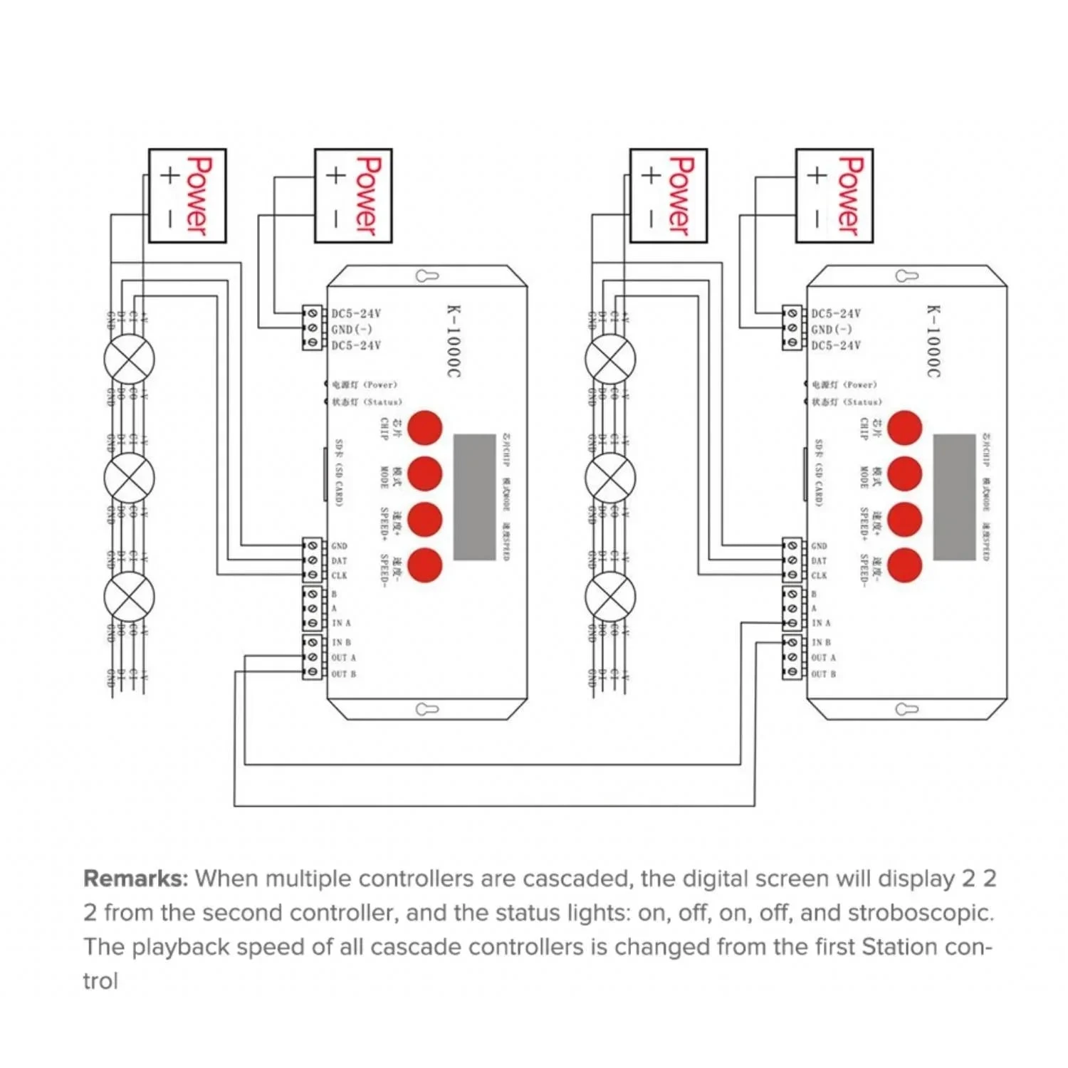 - Cascade Synchronization: There is one port on it, it can support 1536 pixels(DMX LED 512 pixels). Cascade Synchronization is for large pixel projects. We can cascade many controllers. There are K4000C controller max control 4000 pixels, K8000C controller max control 8000 pixels, if you need please contact us.