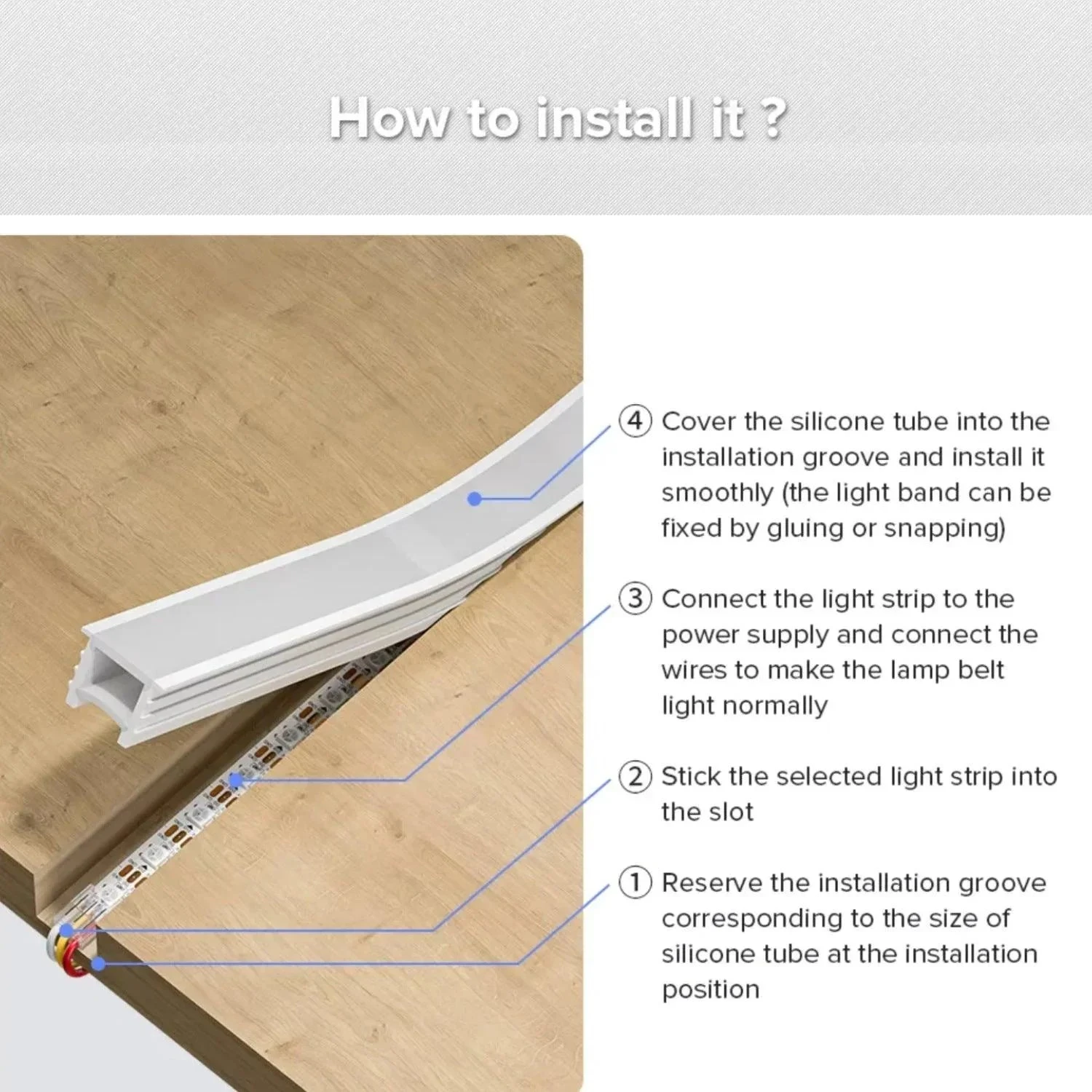 The Silicone Cover Flexible Recessed cover for a Custom 12/24V Neon LED Strip can be installed in all types of installations with LED strips inside, specially designed to protect and hide the LED strips, allowing for professional, clean and stylish installations.