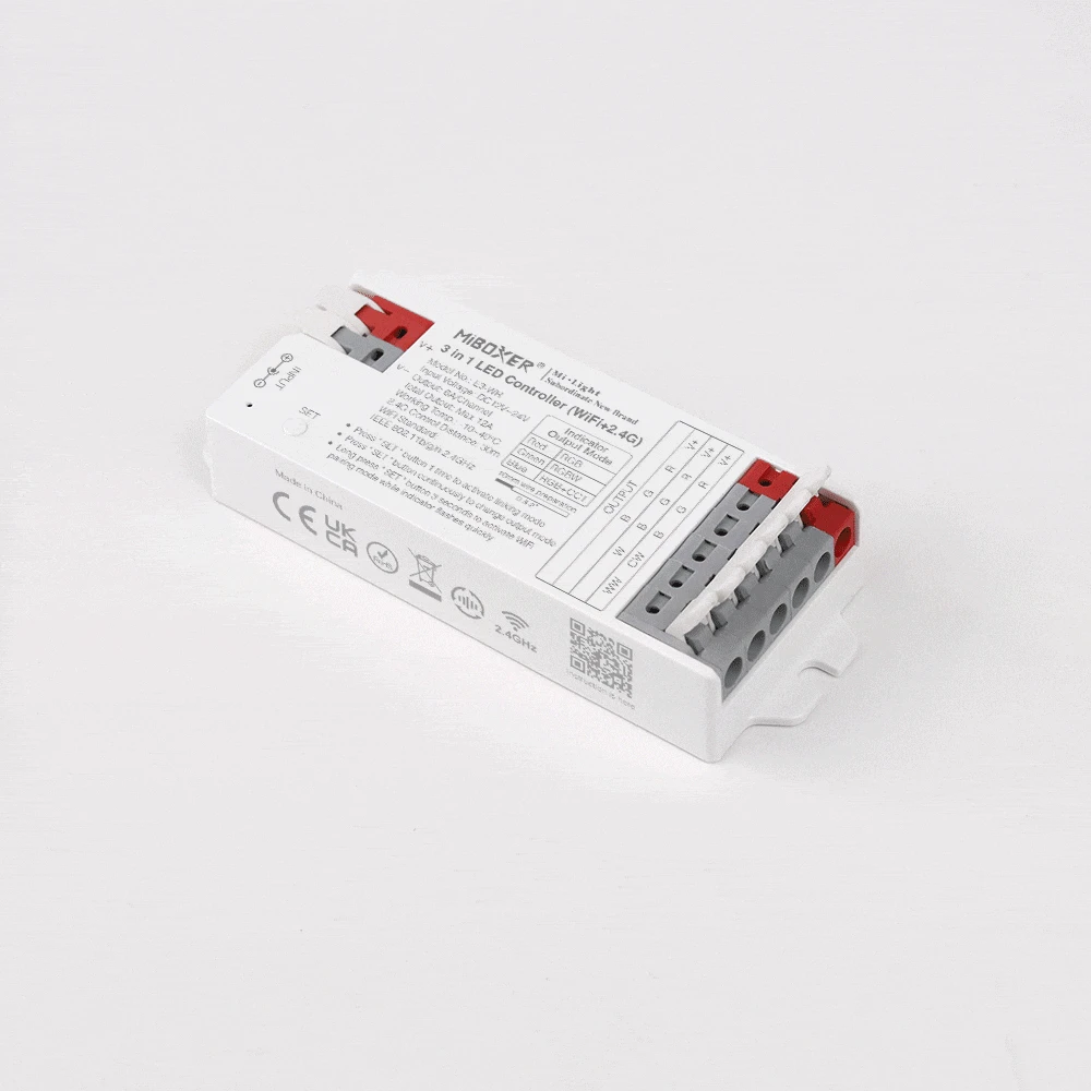 This Mi Light LED controller is compatible with RGB, RGBW and RGB + CCT tuneable LED strip lights and is compatible with both 12V and 24V systems with a maximum current of 12A per channel.