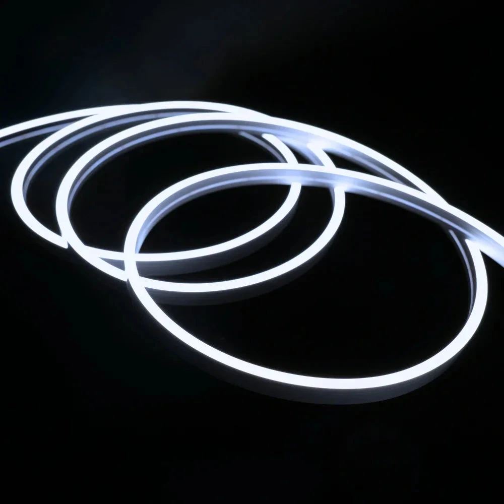 Our smallest most mini Cool White LED Neon Flex 6000K 4x10mm offers a non-spotting, fully diffused light output. The splashproof silicon coating is fully flexible with a bend radius of up to 30mm, making it ideal for use in signage and display installations both indoors and outdoors. It is cuttable every 3.5cm, super bright with 168LEDs per Metre
