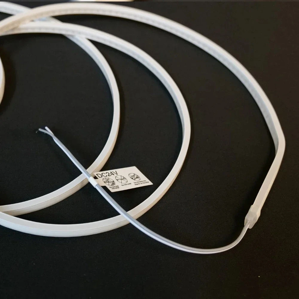 Neon Flex is a durable fully diffused linear light perfect for furniture installations thanks to it’s ultra slimline micro profile. This neon can be cut easily to your desired lengths at the allocated cut points. Maximum length at any time is 7 metres before visible voltage drops occur. You can get 14m continuous length, however, you need to power the led neon flex from both ends.