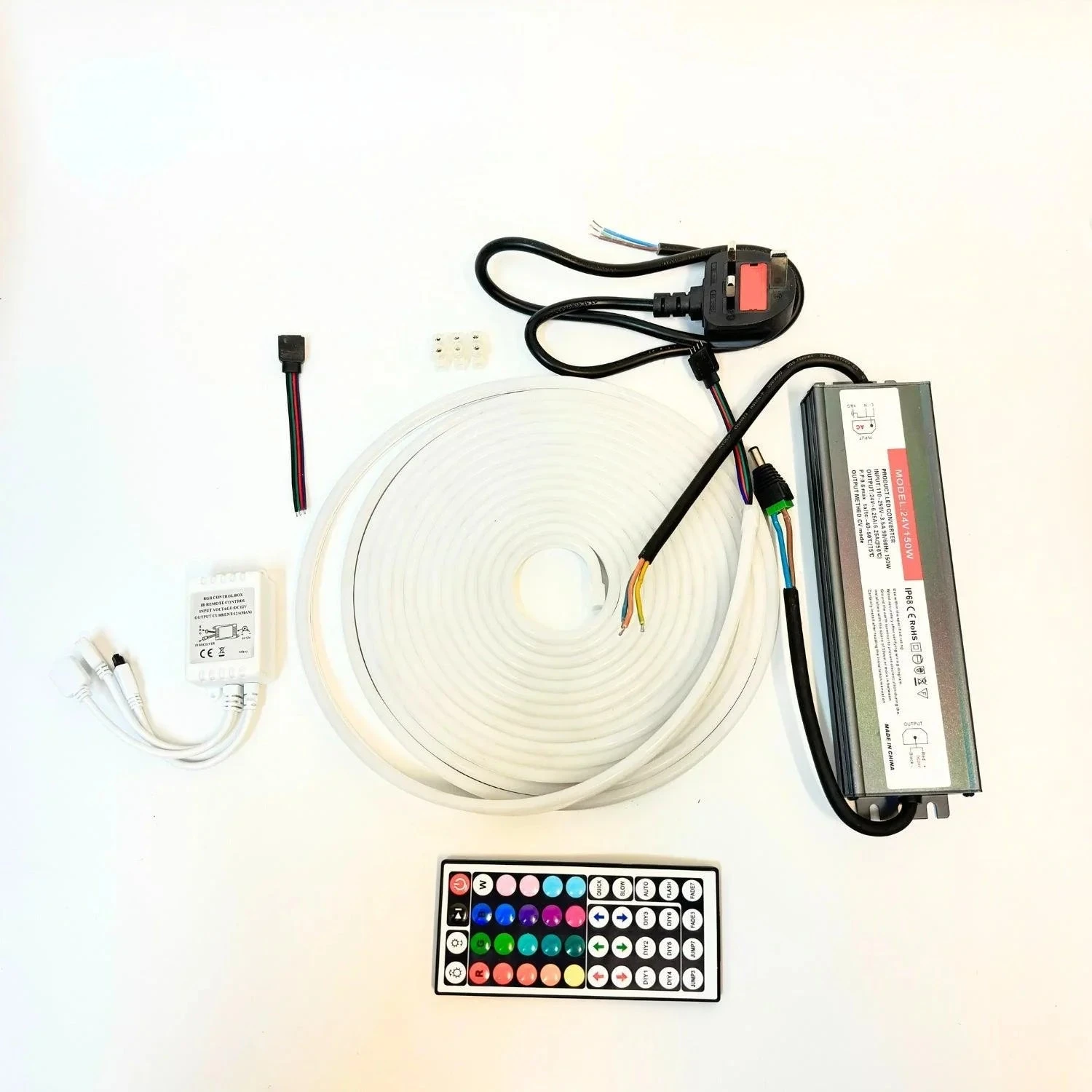 Our 24v product does not come with preset accessories as it requires soldering, although we can supply 24v Power Supplies, RGB controllers, End Caps and Heat shrink. The 24v product requires soldering and uses 4 core wires to power.