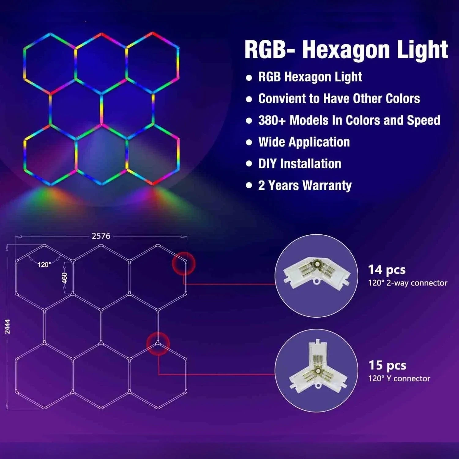 Our RGB hexagon light set is complete with everything you need to install and set up. Hex Dimension  2576mm x 2444mm