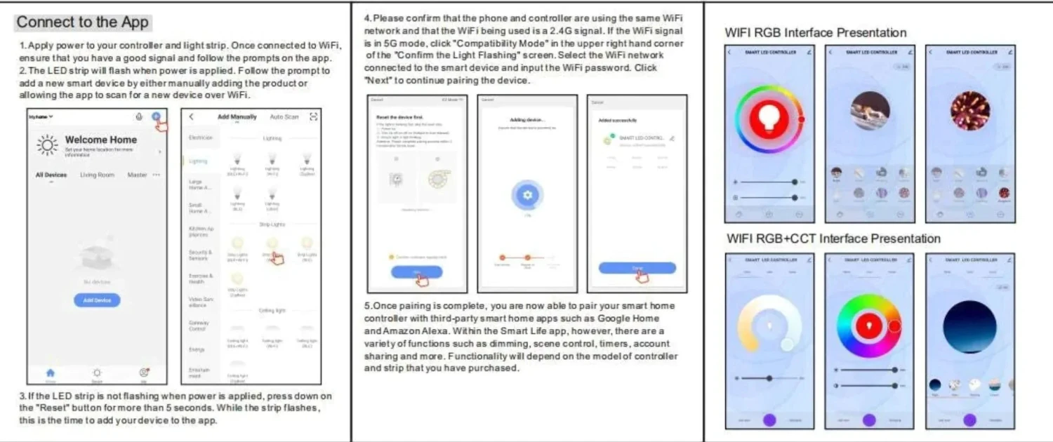 Control Type: Tuya WIFI smartphone APP, infrared 24-key remote control, amazon alexa and google assistant.